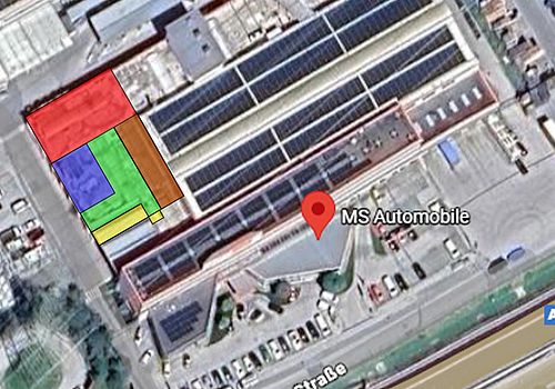 Die Bereiche der Fahrzeugaufbereitung (blau) sowie des Reifen- und Ersatzteillagers (orange) bleiben unverändert und können wie gewohnt genutzt werden.